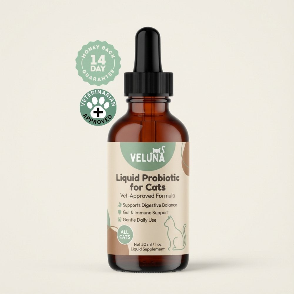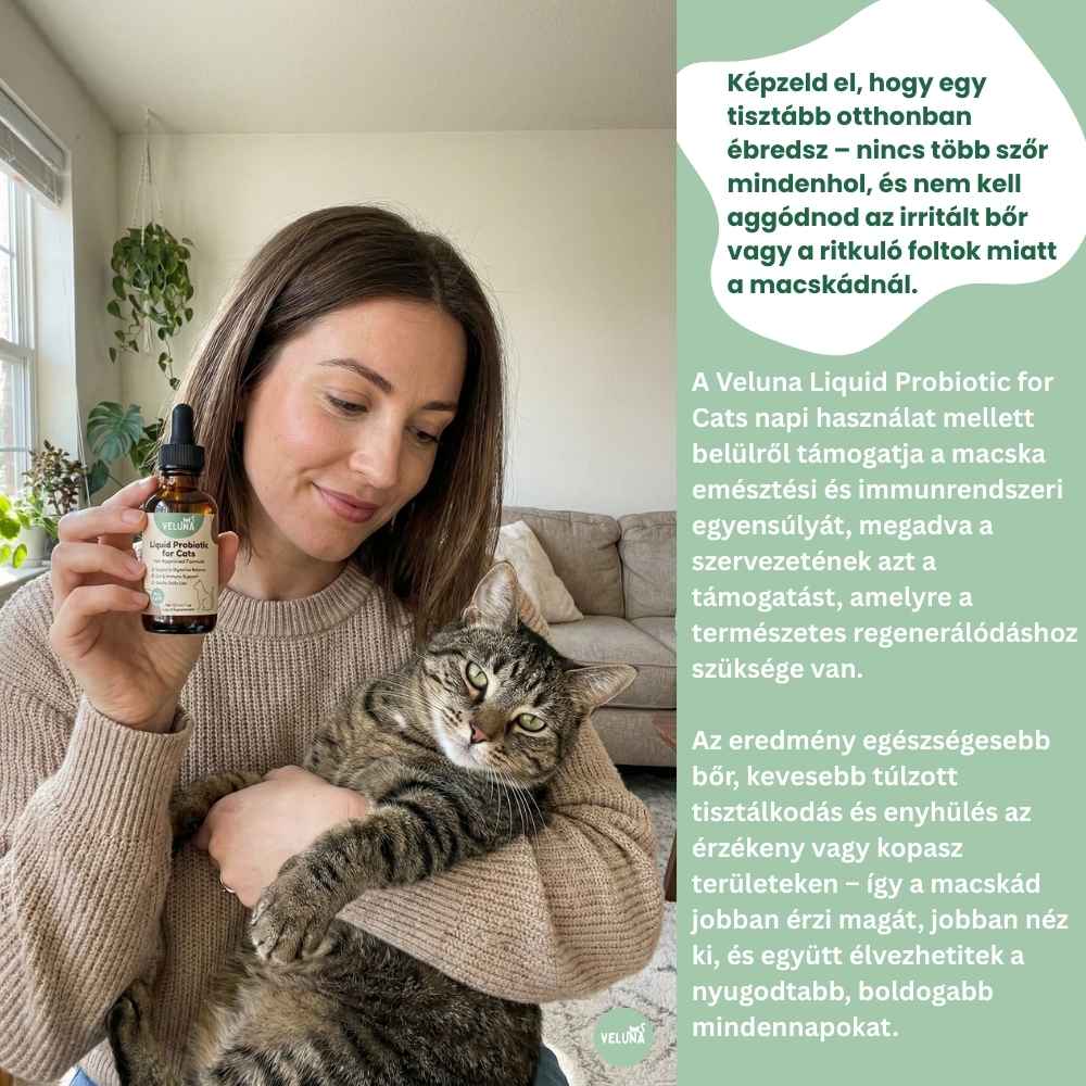 A Veluna Folyékony Fejlett Probiotikum Macskáknak azért készült, hogy kezelje a macskák túlzott tisztálkodásának egyik leggyakrabban figyelmen kívül hagyott okát: a belső egyensúly felborulását. Ez a célzott probiotikum a macska bélrendszerének támogatására lett kifejlesztve, ahol a bőr komfortérzete és a szőrzet egészsége valójában kezdődik.