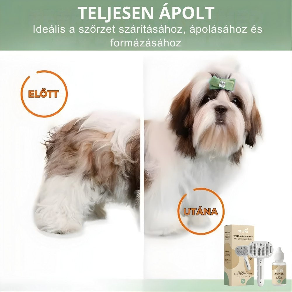 Töltsd fel az beépített tartályt Veluna FreshBrush‑tel vagy vízzel, kapcsold be az enyhe permetet, majd fésüld át a kisállat szőrét. A finom permet fellazítja a szennyeződést és a szőrt, miközben a sörték hatékonyan tisztítanak és kibogoznak.