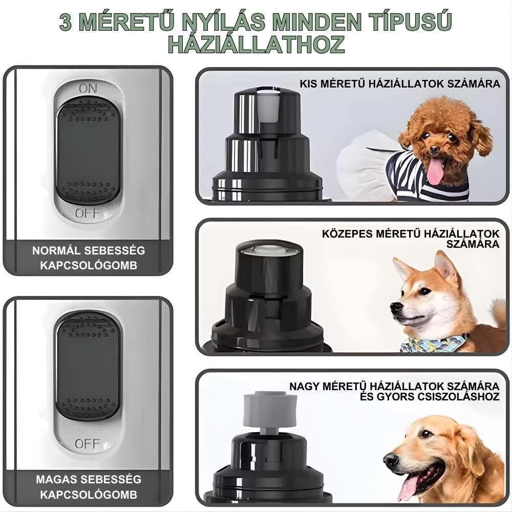 Három csiszolónyílással és két sebességfokozattal biztonságos és hatékony körömápolást biztosít a kiscicáktól a nagytestű kutyákig.